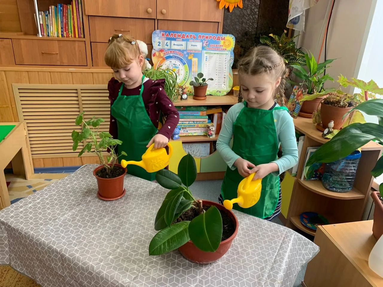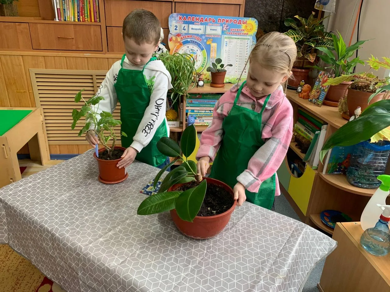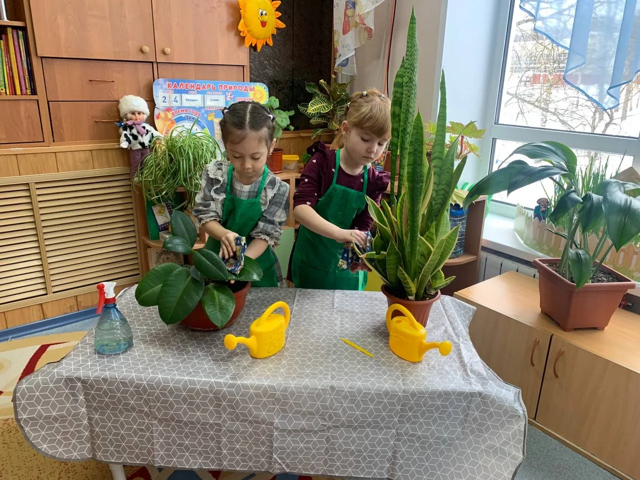 Во время дежурства в уголке природы освоили приёмы ухода за растениями: полив, опрыскивание, рыхение, влажное протирание листьев.